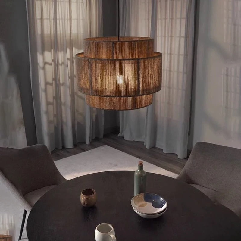 Deze stijlvolle Boho rotan hanglamp met drie ettapes is met de hand gemaakt van natuurlijk gedraaid papierkoord, strak gewikkeld om een stevig metalen frame. Het open weefpatroon zorgt voor een warme, sfeervolle lichtval die prachtig door de ruimte speelt. Dankzij het tijdloze ontwerp past de lamp perfect in zowel een bohemian als een modern Japandi interieur. Ideaal boven de eettafel, in de woonkamer of als eyecatcher in de hal.